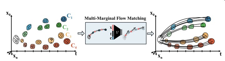 Modeling the dynamics of complex real-world systems from temporal snapshot data is crucial for understanding phenomena such as gene regulation, climate change, and financial market fluctuations. Existing methods based on the Schrödinger Bridge or Flow Matching are limited in their ability to combine data from multiple time points and experimental settings. We propose Multi-Marginal Flow Matching (MMFM), which constructs a flow using smooth spline-based interpolation across time points and conditions, and regresses it via classifier-free guided Flow Matching. This framework shares contextual information across trajectories and significantly outperforms existing methods at imputing data at missing time points, including on a single-cell genomics dataset with chemical perturbations across time.